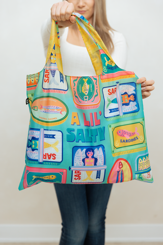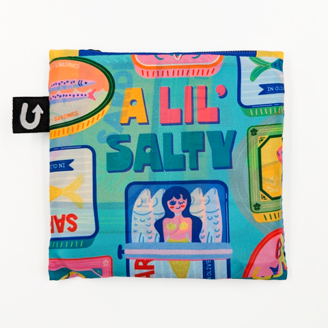 ──────────────── Make your shopping spree a stylish and sustainable adventure with Uptown Sacs - our new foldable tote bags! Made 100% from recycled PET bottles. ──────────────── Size and Weight Capacity •Bag size: 19.5" x 16.5"/ 50cm x 42cm •Can carry up to 20kg/44lbs •Zippered storage pouch size: 4.5" x 4.5"/11.5 x 11.5cm ──────────────── Materials & Attributes •Made from 100% recycled PET bottles •Water resistant and does not fade •Print on Bag: "A Lil' Salty" •Includes a convenient small pocket inside the bag •Is foldable and includes a convenient zippered storage pouch ──────────────── Care •Machine or hand wash and hang to dry •Do not iron or bleach ──────────────── Shipping and Returns Policy Free shipping on orders over $60.