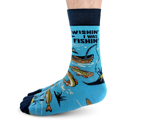 ──────────────── Size Men’s shoe size 7-13 Women's shoe size 9-13 EUR 39-47 ──────────────── Materials & Attributes 70% Combed Cotton, 28% Nylon and 2% Spandex. Reinforced stitching on toe to protect from wear. Print on Socks: "Wishin' I Was Fishin'" ──────────────── Care Machine wash and hang to dry. Do not iron or bleach. ──────────────── Shipping and Returns Policy Free shipping on orders over $60.